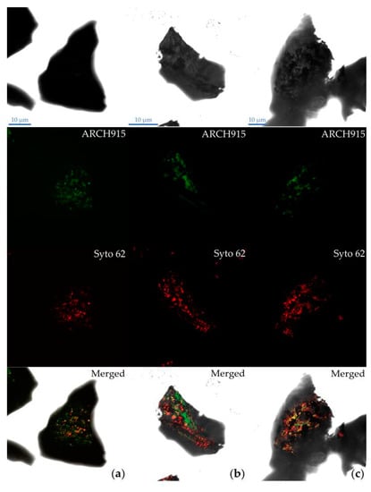 The ARCH915 probe combined with SYTO 62 was used to determine the presence of A. copahuensis cells attached to chalcopyrite grains. The SYTO 62 signal (red) allowed the detection of the entire cell population attached to the mineral, regardless of its metabolic state. While the signal from the ARCH915 probe (green) allowed the detection of achaeal cells with a high number of ribosomes, which is to be expected in metabolically active cells. Sessile cells were detected at all stages of the bioleaching process, from the beginning to the end of the experiment (Figure 2). Sessile cells were heterogeneously distributed on the surface, located mainly near cracks and imperfections of the mineral. During the first days, the SYTO 62 signal colocalized with the ARCH915 probe signal. This result indicates that initially the sessile population was mostly metabolically active. However, a small population of inactive sessile cells was also detected, suggesting that this small population could play an important role in the structure of the biofilm, even in the early stages of its development.