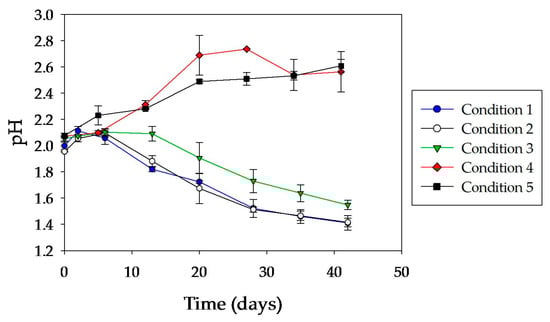 It can be seen in Figure 4 that in both abiotic systems (conditions 4 and 5) there was a rapid increase in pH. This is due to the fact that initially in abiotic systems the dissolution of chalcopyrite was only achieved by a non-oxidative reaction mediated by protons, which releases ferrous iron, copper, and hydrogen sulfide [33]: