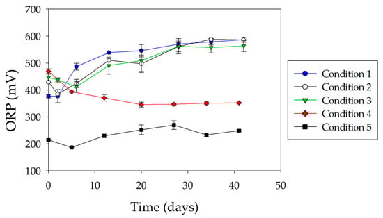 Figure 5 shows the variation of ORP during bioleaching tests. ORP values were mainly governed by the ratio of ferric to ferrous iron [33]. Low ORP values were recorded in abiotic conditions. This is because the dissolution of chalcopyrite released ferrous iron (Equation (1)), and its chemical oxidation was very slow at such low pH values. Comparing both abiotic controls, a high baseline ORP was observed in condition 4, probably due to the ferrous iron oxidation catalyzed by A. copahuensis cells during the pre-colonization step, as long as cells were active. Thus, the increase in ferrous iron concentration reduced the ORP values close to those values reached by the not pre-colonized and non-inoculated system (condition 5).