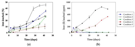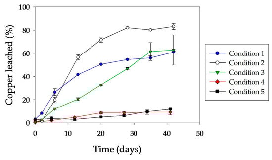 It should be noted that the delay in the pre-colonized abiotic system (condition 4) with respect to the non-inoculated system (condition 5) was also evidenced in the evolution of ferrous iron and total iron concentrations during the experiment (Figure 6). Likewise, a similar trend in copper leaching was observed in both abiotic systems (Figure 7).