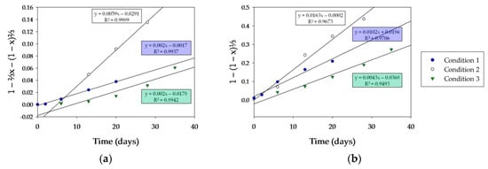 Plots of 1 − ⅔x − (1 − x)⅔ versus time are shown in Figure 8a for the experimental results reported here for the bioleaching conditions. Plots 1 − (1 − x)⅓ versus time are presented in Figure 8b using experimental values.