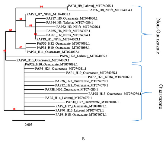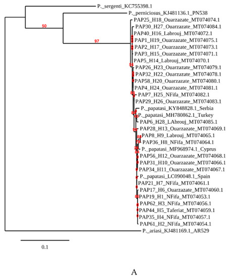 Phlebotomus papatasi belongs to the Phlebotomus subgenus. The consensus tree (Figure 2A) recovered displays that samples from Morocco fall within the clade of other P. papatasi samples collected in Turkey, Spain and Cyprus. They are clearly divergent from P. (Laroussius) ariasi, P. (Laroussius) perniciosus or P. (Transphlebotomus) sergenti which belong to the Laroussius and Transphebotomus subgenus. Overall, within P. papatasi samples collected in Morocco, the presence of at least two P. papatasi populations that fall into two groups which show some genetic relatedness is depicted (bootstrap support values above 50%). Most specimens sampled in the endemic area of Ouarzazate are grouped together and constitute the “Ouarzazate group”, with a bootstrap value of 56%. This group is interrupted by two individuals from Labrouj in the central Morocco area. The other specimens from non-endemic areas, or “Non-Ouarzazate” areas, constitute a geographically mixed group.