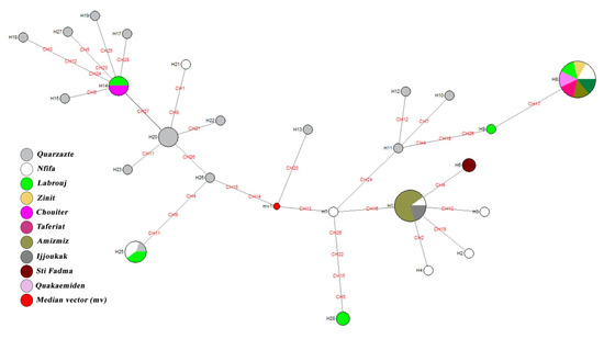 Median-joining network deduced from P. papatasi COI sequences sampled in Morocco. Circle size and color are indicative of the frequency and the geographical location of haplotypes. Haplotype identification is provided next to the corresponding circle. Nucleotide substitutions are highlighted in red.