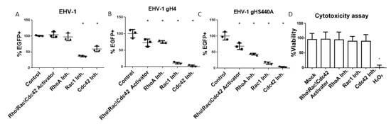 ED cells were treated for 3 h with one of the small GTPase-specific inhibitors NSC 23766 (Rac1 inhibitor), ML-141 (Cdc42 inhibitor), purified C3 transferase (RhoA inhibitor) or the small GTPase Rho\Rac\Cdc42 activator. Cells were then infected in a synchronized manner in the presence or absence of inhibitors or the activator. At three hours post-infection (hpi), cells were analyzed by flow cytometry to determine the progress of infection. In a three-hour infection assay, we observed a significant reduction of EHV-1, which binds to α4β1 integrins, as well as EHV-1 gH4 or EHV-1 gHS440A (these two viruses cannot bind to α4β1-integrin) infections after treatment of cells with Rac1 and Cdc42 inhibitors. The infection of EHV-1 was significantly reduced in cells treated with Rac1 (~60%) and Cdc42 inhibitors (~40%) (Figure 1B). The inhibitory effect of Rac1 and Cdc42 inhibitors was more pronounced in the case of EHV-1 gH4 and EHV-1 gHS440A, where it resulted in an ~80% (Rac1 inhibitor) and ~95% (Cdc42 inhibitor) reduction of infection. The Rho\Rac\Cdc42 activator and RhoA inhibitors had no effect on EHV-1 infection; however, they significantly reduced the infection (30–60% reduction) of EHV-1 gH4 and EHV-1 gHS440A, the two mutants that cannot bind to integrins [], (Figure 1C,D). EHV-4 was not suitable for such an assay, due to the slow onset of eGFP expression that needed long incubation times to be expressed at measurable levels. It is worth mentioning that neither the inhibitors nor the activator had any toxic effect on the cells (Figure 1A).