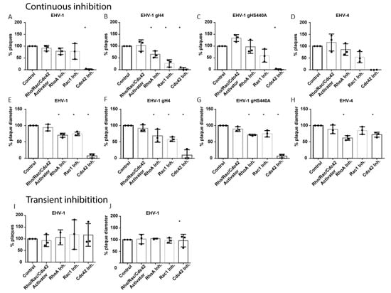Similar to EHV-1, the number of plaques formed by EHV-1 gH4, EHV-1 gHS440A and EHV-4 was significantly diminished by the Cdc42 inhibitor (Figure 2B–D). RhoA and Rac1 inhibitors significantly reduced plaque numbers for EHV-1 gH4. While not statistically significant, a similar trend was observed for EHV-1 gHS440A and EHV-4 (Figure 2B–D). The diameter of plaques formed by EHV-1 gH4, EHV-1 gHS440A and EHV-4 was significantly smaller in the presence of RhoA and Cdc42 inhibitors (Figure 2F–H). It is noteworthy that, after using Cdc42 inhibitor, in particular, the number of plaques was significantly reduced; however, we were able to analyze the diameter of all available plaques in each replicate (see Materials and Methods). The Rac1 inhibitor resulted in a significant reduction of plaque diameters in EHV-1-derived mutants EHV-1 gH4, EHV-1 gHS440A, but not in EHV-4 (Figure 2F–H).