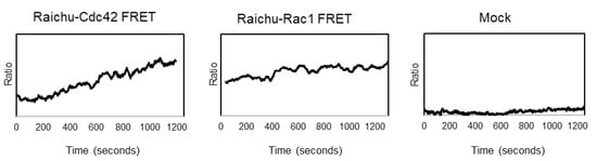 - Yoshizaki, H.; Ohba, Y.; Kurokawa, K.; Itoh, R.E.; Nakamura, T.; Mochizuki, N.; Nagashima, K.; Matsuda, M. Activity of Rho-family GTPases during cell division as visualized with FRET-based probes. J. Cell Biol. 2003, 162, 223–232. [Google Scholar] [CrossRef] [PubMed]