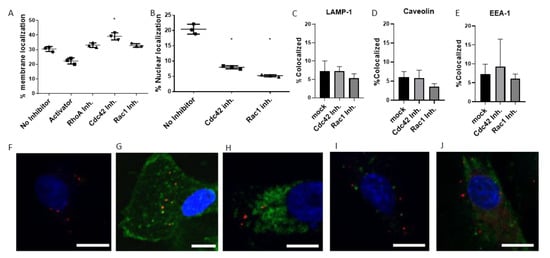 The entry of EHV-1 into equine ED cells can either be through direct fusion with the plasma membrane, or after interaction with the α4β1 integrins that induce a signaling cascade, triggering the fusion process. Alternatively, if integrin binding is altered and the signaling cascade abrogated, EHV-1 is redirected to the endosomal pathway []. Virus particles are then transported inside the cell to the nucleus along microtubules [], where replication takes place. We investigated whether small GTPases play a role in the virus transport that might lead to a reduction of infection, as seen in Figure 1. The transient effects of GTPase inhibitors on EHV-1 infection (Figure 2) indicated that GTPases play a role at steps of infection after cell entry. In a time-resolved fashion, we investigated three loci for the presence of virus particles after infection: (i) the plasma membrane at 30 min post infection, (ii) endosomes at three hours post infection, and (iii) nucleus or cytoplasm at six hours post infection. ED cells were treated with chemical inhibitors of small GTPases for three hours, then infected with EHV-1, and fixed after 30 min, 3 or 6 hpi. One-hundred virus particles were counted manually in a blinded fashion in three replicates for each setup. For the 30-min setup, each particle was counted as on cell borders (colocalized with the plasma membrane), as visualized by FITC-labeled lectin. The treatment of cells with Cdc42 inhibitors resulted in a small, yet significant, increase in the number of virus particles that were colocalized with the plasma membrane when compared to mock-treated cells (Figure 4A). A decrease in colocalization with the plasma membrane was determined after treatment of cells with Rho\Rac\Cdc42 Activator (Figure 4A). We did not observe a change in numbers of plasma membrane-localizing viruses after treatment with Rac1 or Rho inhibitors (Figure 4A). Additionally, we did not record any increase in virus colocalization with endosomes, lysosomes, or caveolae at 3 hpi in inhibitor-treated cells when compared to mock-treated cells (Figure 4C–E). We further investigated the efficiency of virion delivery to the nucleus in the inhibitor-treated ED cells, by counting the number of virus particles in the perinuclear zone and the cytoplasm. Both Cdc42 and Rac1 inhibitors resulted in a significant delay of virus transport to the nucleus when compared to virus transport in mock-treated cells: a significantly smaller number of virus particles reached the nucleus, and the majority remained in the cytoplasm at 6 hpi (Figure 4B). Taken together, these findings indicated that the small GTPases, Cdc42 and Rac1, play a role in the transport of the virus particles to the cell nucleus.
