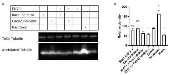Immunoblotting was performed to quantify the proportion of acetylated tubulin []. On the day of the experiment, 4 × 105 293T cells in a 12-well plate were serum-starved for 1 h. Cells were treated with small GTPase inhibitors in DMEM for 3 h in a cell culture incubator. The inhibitor-treated 293T cells were infected with EHV-1 at a MOI of 10, for 1 h and lysed on ice as described before []. Paclitaxel (T7191 Sigma-Aldrich), a chemical inducer of microtubule acetylation, was used as a positive control. Briefly, 293T cells were serum-starved for 1 h, overlaid with serum-free DMEM containing Paclitaxel at a final concentration of 10 μM for 1 h, and finally, lysed on ice. Cell lysis was achieved by heating the sample to 98 °C in sodium dodecyl sulfate (SDS) sample loading buffer (1 M Tris-HCl (pH 6.8), 0.8% sodium dodecyl sulfate (SDS), 40% glycerol, 0.2% β-mercaptoethanol, 0.02% bromophenol blue) for 10 min. A 12% SDS-polyacrylamide gel was used to separate the proteins based on their molecular weight. Semi-dry transfer was used to transfer proteins to the polyvinylidene fluoride (PVDF) membrane []. Immunoblot analysis was done with monoclonal anti-acetylated tubulin 6-11B-1 antibodies (T7451, Sigma-Aldrich), at a dilution of 1:100. Total tubulin was detected with polyclonal anti-tubulin α antibody (SAB4500087, Sigma-Aldrich) at a 1:500 dilution. Secondary anti-mouse and anti-rabbit HRP (ab97023, ab6721, Abcam, respectively) conjugated antibodies were used at a 1:1000 dilution. Densitometry was done using ImageJ (NIH), by measuring the intensity of all pixels comprising the band of interest []; the relative density of the bands from each experiment was recorded.