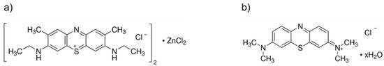 A stock solution (500 μM) of New Methylene Blue (New Methylene Blue N zinc chloride double salt; C18H22ClN3S 0.5 ZnCl2; IUPAC name: dichlorozinc ethyl-[7-(ethylamino)-2,8-dimethylphenothiazin-3-ylidene]azanium chloride; CAS 6586-05-6; dye content 90%; Sigma-Aldrich®/Merck KGaA, Darmstadt, Germany) (Figure 1a) was prepared in dimethyl sulfoxide (DMSO). A stock solution (500 μM) of Methylene Blue (C16H18ClN3S xH2O; IUPAC name: 3,7-bis(dimethylamino)phenazathionium chloride; CAS 122965-43-9; dye content ≥ 82%; Sigma-Aldrich®/Merck KGaA, Darmstadt, Germany) (Figure 1b) was prepared in PBS. Both stock solutions were wrapped in aluminum foil and stored in glass flasks in the dark, being sonicated in an ultrasonic bath for 15 min before each assay.