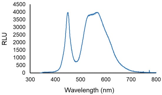 The artificial white light was provided by a LED projector, (EL®MARK, power, voltage, and frequency of 20 W, ~230 V and ~50 Hz, respectively). The spectral range of the white light emitted by the LED projector is shown in Figure 2. The light irradiance was measured and adjusted to 50 mW cm−2 with the aid of a power and energy meter (model FieldMaxII-Top from Coherent, Santa Clara CA, USA) connected to a high-sensitivity sensor (model PS19Q, Coherent).