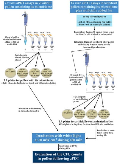 aPDT assays were performed with kiwifruit pollen containing its natural microorganisms (not contaminated artificially with Psa, hereafter designated as non-contaminated pollen) and in kiwifruit pollen containing its natural microorganisms and artificially contaminated with Psa.