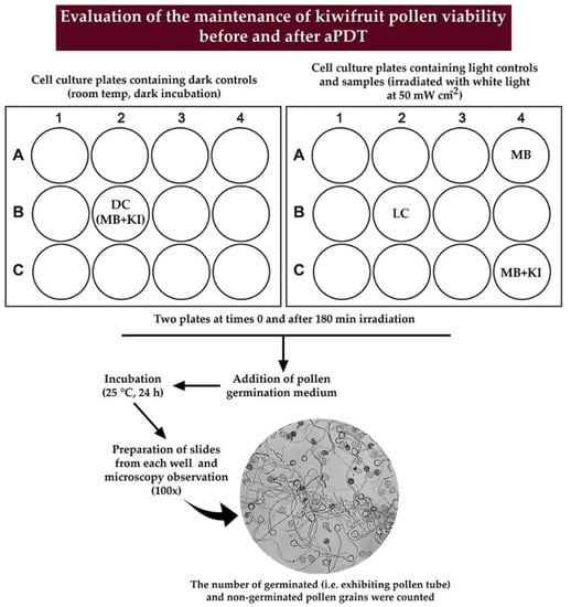 The same procedure was used for the aPDT assays performed with the kiwifruit pollen artificially contaminated with Psa. The assays were also performed with MB in the absence and the presence of KI.