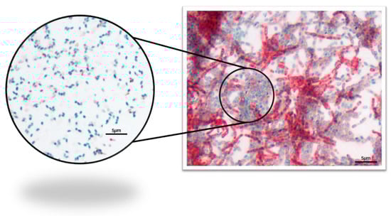 Since the ex vivo aPDT assays were performed in trade pollen that already contained its natural microorganisms, the pollen natural microorganisms were first quantified (Figure 5). As pollen is not a nutrient-rich matrix and water availability is low, suggesting the growth of some bacteria but also of some fungi and some sporulating bacteria, the bacterial, fungal, and bacterial endospore concentrations on the pollen grains were determined. A microbial concentration of around 5 log CFU mL−1 was determined in LA (a non-selective medium), which allows mainly the growth of bacteria, but also of some fungi after 48 h of incubation [44]. The fungal concentration was also determined in RBCA (a fungi selective medium) after five days of incubation. A fungal concentration of 4.7 log CFU mL−1 was determined. In addition, 3.6 log CFU mL−1 of bacterial endospores was observed in the heated pollen suspension incubated in the LA. The Schaeffer–Fulton stain allowed visualizing the high number of endospores (Figure 6). The addition of the manganese sulfate to the culture medium promoted the bacterial sporulation, confirming the existence of endospore-forming bacteria on the pollen. These results (Figure 5 and Figure 6) show that the microorganisms naturally present on pollen are abundant and that some less aPDT susceptible microorganisms (bacterial endospores and fungi) relatively to Psa (a non-sporulating Gram-negative bacterium) are present in higher concentrations [45,46]. In fact, the aPDT treatments performed with MB at 50 μM with non-contaminated pollen were almost ineffective against the natural microorganisms of pollen (Figure 8). Even with the addition of KI (at 100 mM), a decrease of only 1.1 log CFU mL−1 (ANOVA, p < 0.05) was observed (Figure 8), which can be justified by the high concentration of fungi and endospores present on the pollen.
