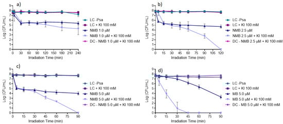 In vitro inactivation of Psa CRA-FRU 8.43 via aPDT, using NMB at: (a) 1.0 μM; (b) 2.5 μM; and (c) 5.0 μM; and (d) MB at 5.0 μM as photosensitizers, in the absence and presence of KI (at 100 mM). Values represent the mean of three independent assays in triplicate; error bars represent the standard deviation. LC, light control; DC, dark control. Lines just combine the experimental points.