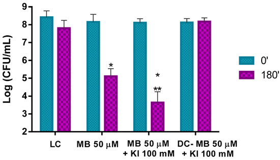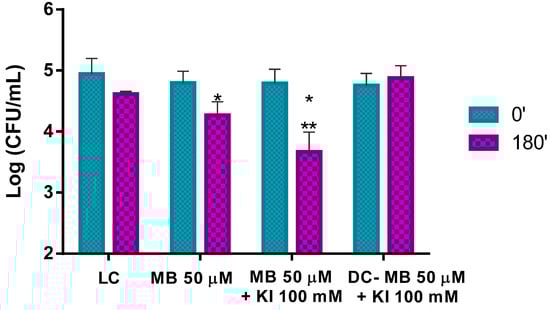 When aPDT treatment was carried out with the combination of MB at 50 μM and KI at 100 mM, a decrease of ca. 4.5 log CFU mL−1 (ANOVA, p < 0.05) was observed under the same irradiation conditions. This corresponds to an additional significant decrease of ca. 1.4 log CFU mL−1 (ANOVA, p < 0.05) when comparing the results with the PS alone, showing, again, the potentiator effect of KI (Figure 10).