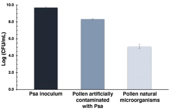 The Psa inoculum used to contaminate the pollen had a concentration of 9.7 log CFU mL−1, leading to a total of 8.3 log CFU mL−1 on pollen (which corresponds to pollen natural microorganisms plus added Psa). This value is clearly above pollen natural microorganisms’ concentration, which is 5.1 log CFU mL−1. These results indicate that ca. 3.2 log CFU mL−1 of Psa was added to pollen.