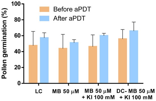 Evaluation of pollen germination before and after aPDT. Values represent the mean of pollen germination percentage resulting from three independent assays in triplicate; error bars represent the standard deviation.