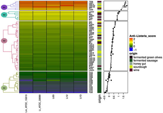 Cluster analysis shown as a heat-map with boxplot annotation concerning the anti-Listeria activity (Anti-Listeria_score) produced by sixty-seven Lactiplantibacillus plantarum strains isolated from different sources (origin). The anti-Listeria activity was assayed against Listeria monocytogenes (Lm_ATCC_15313) and four strains of Listeria innocua (Li_ATCC_33090, Li03, Li12, Li13).