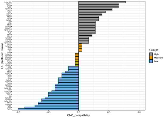 Barplots of the CNC_compatibility index expressed by sixty-seven strains of Lactiplantibacillus plantarum against Staphylococcus xylosus MVS9. The different colors indicate strains grouped on the basis of high, moderate, or low compatibility.