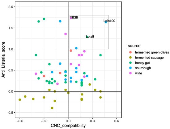 In order to select the most appropriate protective strain for low-fat and high-quality fermented sausage, the interactions with strains of conventional starter cultures were assessed. This aspect, in the last decade, has been adopted in the selection of fermentative starter cultures [,]; however, there is still little consideration of the selection of protective cultures. To date, only Corbo et al. [], in the selection of antagonistic cultures for sausages, evaluated the interactions with starter strains highlighting substantial neutralism. In our study, several positive or negative interactions between Lb. plantarum strains and S. xylosus strains were detected. Therefore, data from anti-Listeria activity and from the interactions with S. xylosus strains were combined and analysed together. In Figure 3, the scatterplot highlights the relationship between “CNC-compatibility” and the “Anti-Listeria_score” for each Lb. plantarum strain.