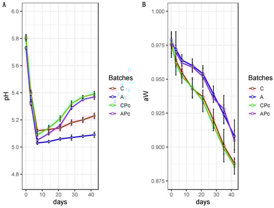 Line plots showing the behaviour of pH (A) and aw (B) in samples from batch C, conventional fermented sausage prepared with starter culture and 14% minced pork fat addition; batch A, prepared with 4% lemon albedo in total replacement of pork fat and starter culture addition; batch CPc, prepared with starter culture and 14% minced pork addition plus anti-Listeria Lactiplantibacillus plantarum Lpls100; batch APc, prepared with 4% lemon albedo in total replacement of pork fat and starter culture addition plus anti-Listeria Lactiplantibacillus plantarum Lpls100. The data are reported as mean values with error bars.