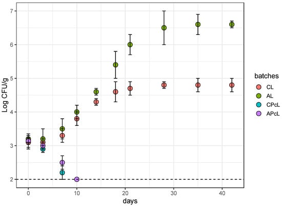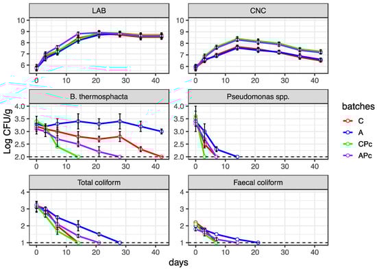 Line plots showing the behaviours of the main microbial groups in samples from batch C, conventional fermented sausage prepared with starter culture and 14% minced pork fat additions; batch A, prepared with 4% lemon albedo in total replacement of pork fat and starter culture addition; batch CPc, prepared with starter culture and 14% minced pork addition plus anti-Listeria Lactiplantibacillus plantarum Lpls100; batch APc, prepared with 4% lemon albedo in total replacement of pork fat and starter culture addition plus anti-Listeria Lactiplantibacillus plantarum Lpls100. The data are reported as the mean value with error bars. The dashed lines represent the limit of detection of the microbial groups.