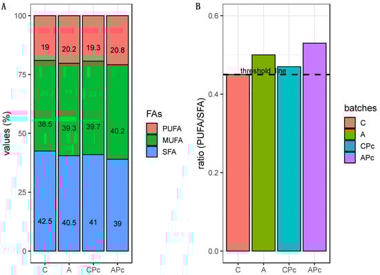 Stacked bar plot (A) showing the distribution of fatty acids (PUFA, MUFA, SFA) and bar plot (B) showing the ratio PUFA/SFA in samples from batch C, conventional fermented sausage prepared with starter culture and 14% minced pork fat additions; batch A, prepared with 4% lemon albedo in total replacement of pork fat and starter culture addition; batch CPc, prepared with starter culture and 14% minced pork addition plus anti-Listeria Lactiplantibacillus plantarum Lpls100; batch APc, prepared with 4% lemon albedo in total replacement of pork fat and starter culture addition plus anti-Listeria Lactiplantibacillus plantarum Lpls100. The dashed line represents the threshold value 0.45.