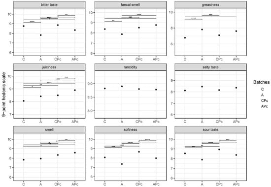 Jitter plot showing nine sensory attributes at the end of ripening time (42 days) in samples from batch C, conventional fermented sausage prepared with starter culture and 14% minced pork fat additions; batch A, prepared with 4% lemon albedo in total replacement of pork fat and starter culture addition; batch CPc, prepared with starter culture and 14% minced pork addition plus anti-Listeria Lactiplantibacillus plantarum Lpls100; batch APc, prepared with 4% lemon albedo in total replacement of pork fat and starter culture addition plus anti-Listeria Lactiplantibacillus plantarum Lpls100. Black dots represent the mean value of 50 records. Statistical significance: **** p < 0.0001; *** p < 0.001; ** p < 0.01; * p < 0.05.
