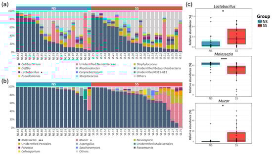 A total of 23 phyla and 322 genera were found in the bacterial communities. Although the taxonomic composition varied depending on the subjects, the following four phyla occupied ≥90% of the skin microbiome across all the samples: Actinobacteria (39.6%), Proteobacteria (35.5%), Firmicutes (13.8%), and Bacteroidetes (4.8%). At the genus level, Cutibacterium (36.32%) and unidentified Neisseriaceae (10.36%) were the most abundant bacterial genera, followed by Staphylococcus (4.40%) and Delftia (3.44%). We observed a lower proportion of Actinobacteria, Proteobacteria, and Bacteroidetes, but a higher proportion of Firmicutes, on SS compared to NS. Lactobacillus belonging to Firmicutes was significantly more abundant on SS (Figure 2a and Table S5). In the fungal communities, seven phyla and 112 genera were identified in total. Basidiomycota (83.75%) was the predominant phylum, followed by Ascomycota (8.38%) and Mucoromycota (7.57%). Although Malassezia (80.38%) of the Basidiomycota phylum was the predominant fungal genus in the skin mycobiome of all the subjects, it was significantly less abundant on SS (71.61%) than on NS (91.0%). Conversely, the Mucor fungal genus of the Mucoromycota phylum was more abundant on SS (Figure 2b and Table S6).