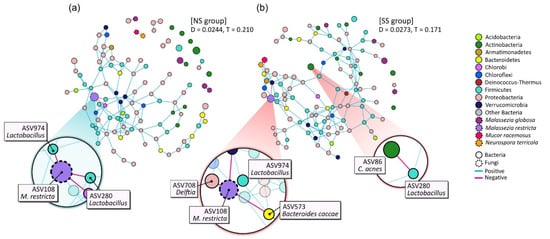 The microbial networks were constructed to identify the bacterial and/or fungal interactions by using the combined dataset pertaining to the microbiome and mycobiome (Figure 4). The overall structures of the networks noticeably differed between SS and NS. The edge density (D) of the network was higher in the SS than in the NS group, but the transitivity (T), or clustering coefficient, was substantially lower. Whereas most of the nodes in the SS microbial network participated in the interactions as one massive cluster, the NS microbial network was composed of multiple clusters, including a complex major cluster.