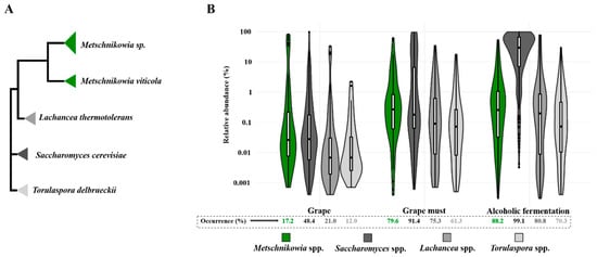 (A) Scheme of the phylogenetic relationship between Metschnikowia sp. (including isolates of M. pulcherrima and M. fructicola species), M. viticola, Saccharomyces cerevisiae, Torulaspora delbrueckii, and Lachancea thermotolerans, using 26S rRNA sequences. (B) Occurrence rates and relative abundance values at different winemaking stages for the above-mentioned yeast genera (personal communication from A. Acedo; values estimated from a large-scale NGS amplicon-based survey).