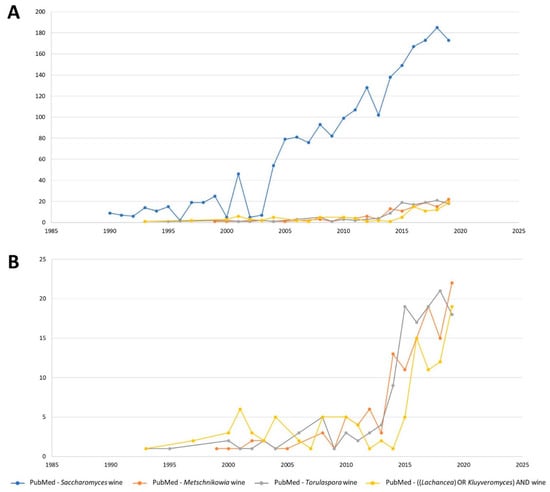 Graphical representation of the number of publications by year (1990 to 2020) related to a yeast genus and wine search in PubMed. (A) Results looking for Saccharomyces, Metschnikowia, Torulaspora, and Lachancea (or Kluyveromyces). (B) Detail of the results looking for Metschnikowia, Torulaspora, and Lachancea (or Kluyveromyces).