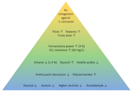 In our opinion, the first parameter to take into account in a M. pulcherrima selection process must be the absence of antagonism effects against S. cerevisiae as any positive effect over wine would have no sense if a proper alcoholic fermentation cannot take place. The main advantage about using M. pulcherrima is due to its positive influence on wine aroma. Regarding this fact, M. pulcherrima strains should be selected in order to release varietal aroma compounds, such as thiols and terpenes, while producing fruity esters such as ethyl octanoate. Fermentative power together with ethanol and sulfur dioxide resistance should be considered in order to allow the selected strains to perform longer during industrial alcoholic fermentations to make it easy to achieve the desired quality objectives. These parameters remain as the main limitation of the available commercial strains. Other secondary positive effects that could be selected are the ability to reduce the final ethanol content and to increase the glycerol concentration in final wines. Some parameters of additional interest are the anthocyanin absorption and polysaccharides release. Finally, some negative parameters reported for some M. pulcherrima strains such as diacetyl, acetoin, higher alcohols, or acetaldehyde must be avoided in the selected strains. Figure 3 summarizes the proposed M. pulcherrima selection parameters.