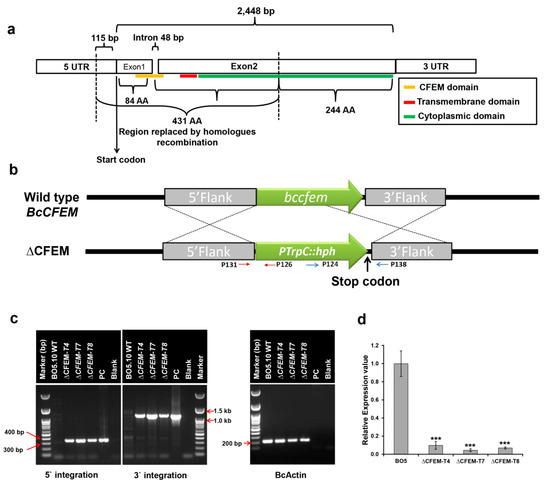 - Zhu, W.; Wei, W.; Wu, Y.; Zhou, Y.; Peng, F.; Zhang, S.; Chen, P.; Xu, X. BcCFEM1, a CFEM domain-containing protein with putative GPI-anchored site, is involved in pathogenicity, conidial production, and stress tolerance in Botrytis cinerea. Front. Microbiol. 2017, 8, 1807. [Google Scholar] [CrossRef] [PubMed]