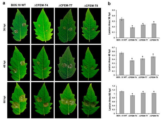 To study the effect of CFEM deletion on B. cinerea virulence, we compared the infection process of the different isolates on detached tomato leaves inoculated with conidia (Materials and Methods). During the first 24 hpi, we did not observe any visible symptoms in CFEM deletion mutants. However, clear visible infection regions were observed in the WT strain (Figure 2a). A significant reduction in the lesion size was observed in all three CFEM deletion mutants at 48 hpi (reduction in lesion area of 35% for ΔCFEM-T4, 25% for ΔCFEM-T7, and 18% in ΔCFEM-T8 compared with the WT BO5 isolate (Figure 2b).