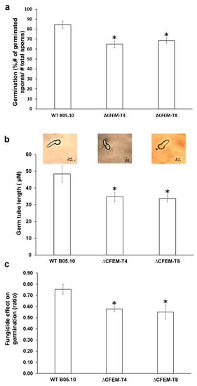 Since CFEM mutants exhibited reduced pathogenicity on tomato leaves, we were interested in studying the potential physiological mechanism involved in this phenotype. Therefore, we compared conidial germination of the WT with that of two deletion mutants. The CFEM mutants exhibited a significant reduction in conidia germination (23 and 19% reduction in ΔCFEM-T4 and ΔCFEM-T8, respectively) compared with the WT isolate (Figure 3a). In addition to the binary phenotype of germinating/non-germinating, we were also interested in studying potential difference in the germ tube elongation that proceeds the germination. The CFEM mutants exhibited a significant reduction in germ tube length (30 and 19% reduction in ΔCFEM-T4 and ΔCFEM-T8, respectively) compared with the WT (Figure 3b). To further study the role of germination in CFEM mutants, we monitored germination in the presence of the germination inhibitor pyrimethanil (2.0 mg/L). The CFEM mutants showed 70% more inhibition in germination than the WT (42 and 45% inhibition in ΔCFEM-T4 and ΔCFEM-T8, respectively, compared with 25% inhibition in the WT in the presence of the germination inhibitor pyrimethanil (Figure 3c)).