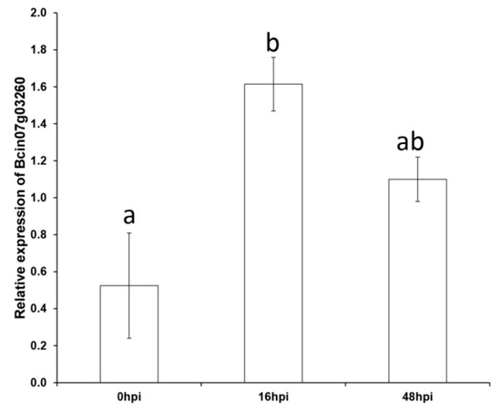 Expression levels of CFEM-Bcin07g03260 encoding for the predicted membrane protein in WT. Gene expression levels were monitored by real-time qPCR from infected tomato leaf tissue of whole plants (at 0, 16, and 48 h post infection; two independent biological replicates per treatment). The y axis represents fold change compared with the housekeeping gene encoding for ubiquitin-conjugating enzyme (UCE), based on ΔCt values. ANOVA showed a significant difference between time points (p value < 0.05). Different letters indicate a significant difference between pairs (e.g., 0 hpi vs. 16 hpi) based on Tukey HSD (p value < 0.05). Error bars represent ±SE.
