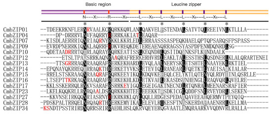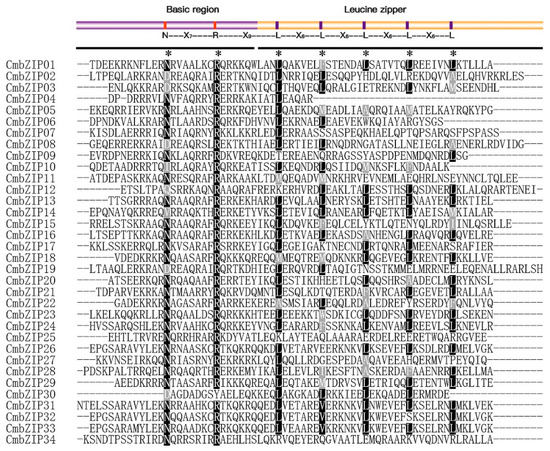 Multiple sequence alignment of CmbZIP domains. Amino acid sequences of CmbZIP domains are aligned by MUSCLE V3.8.1551 with minor modifications. The model and invariant of the basic region and leucine zipper are shown in the upper part. Asterisks show the conserved amino acids of bZIP domain. White letters in black shadow indicate conserved amino acid residues in right position, and gray shadow is for the position replaced by other less conserved amino acids.