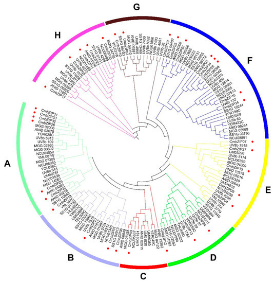 To investigate the evolutionary relationship among the CmbZIP genes and other fungal bZIP genes, a phylogenetic analysis was constructed based on a total 159 bZIP proteins including 34 CmbZIP proteins and 125 selected other fungal bZIP proteins (Figure 2). The 159 bZIP genes were divided into eight clades (designated as A to H). In general, the bZIP genes from 8 fungi including the 34 CmbZIP genes were distributed evenly to all these clades, indicating that these bZIP genes were evolved before divergence of these fungi. Four CmbZIP genes (CmbZIP26, CmbZIP31, CmbZIP32, and CmbZIP33) in clade A were closer than other bZIPs, suggesting that a genome duplication event had been happened in recent period.