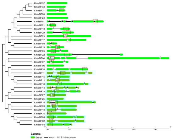 Analysis of gene structures of CmbZIPs. Arrangements of introns and exons are displayed by GSDS version 2.0. Red dotted boxes, representing the bZIP domains of each sequence, are marked manually. Green boxes indicate exons, drawn to scale. Black lines between exons represent introns. The number 0, 1, and 2 represent the splicing phase of intron. Phase 0 means intron splicing site is between codons, and phase 1 and phase 2 means the intron splicing site is located after the first and second nucleotide of a codon, respectively.