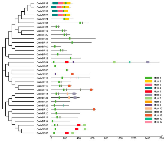 Previous study suggested that additional domains in the bZIP proteins endowed bZIP genes with different functions [62]. To gain insights into the additional structural features in the CmbZIP genes, sequences were analyzed by MEME. In total, 14 additional structural features, including the basic region, were identified in the CmbZIP proteins (Figure 5, Figure S2). The length of these conserved motifs ranged from 6 to 80 amino acids. Based on the multilevel consensus amino acid sequences of motifs, motif 1 represented the basic region and the first leucine (L) of leucine zipper. Motif 1 existed in all the CmbZIP proteins, except the CmbZIP30, consistent with the result of multiple sequence alignment. The consensus amino acid sequence of motif 11 was similar to the leucine zipper, which kept in step with motif 1 in many CmbZIP proteins. Motif 5 equaled to Pfam DUF3425 existed in CmbZIP02, CmbZIP03, CmbZIP04, and CmbZIP08. Four CmbZIP proteins (CmbZIP26, -31, -32, and -33) shared almost the same additional motifs (motif 1, motif 2, motif 3, motif 4, and motif 8), except CmbZIP31 without motif 8. This is consistent with the result of the phylogenetic analysis.