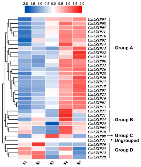 Previous studies have demonstrated that conidiogenesis is a critical step in the life cycle of C. minitans, and it has been divided into five stages, S1: hyphal growth stage (48 hpi), S2: primordial formation stage (60 hpi), S3: pycnidial initiation stage (72 hpi), S4: pycnidial formation stage (84 hpi), and S5: pycnidial maturation stage (96 hpi) [63,64]. To gain insight into the potential functions of the 34 CmbZIP genes in conidiogenesis, the expression pattern of CmbZIP genes during the five stages of conidial development were examined by RT-qPCR. Based on the gene expression profiles, except CmbZIP31 whose expression was silent, all the CmbZIP genes could be divided into four groups (Figure 7). The group A including 22 genes (64.7%) was upregulated in the later stages (S4–S5) of conidial development, representing the major expression patterns of CmbZIPs. The group B included six genes, whose expression pattern was significantly induced in the S4 stage and decreased in the S5 stage. The group C included only the CmbZIP09 gene, which was upregulated in the S3 stage and then downregulated at later stages. Finally, the group D included five genes, which were upregulated in the early stage (S1–S2) and downregulated in the later stages (S3–S5). These results indicated that individual CmbZIP genes were responsible for different stages of conidial development.