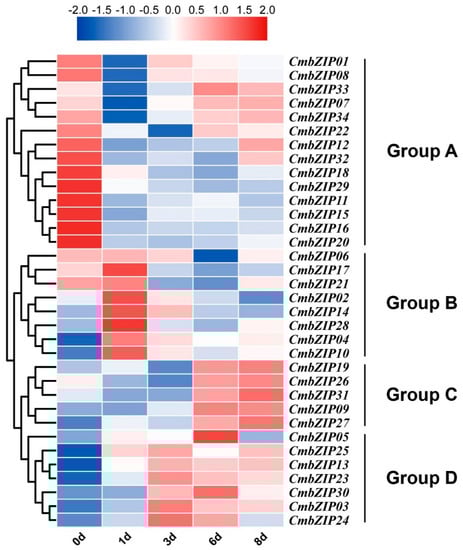 To investigate the response of the CmbZIPs to various environmental stresses at transcriptional levels, the transcription patterns of CmbZIPs under different treatments were measured by RT-qPCR (Figure 6). Under NaCl treatment (1 mol L−1), three CmbZIPs (CmbZIP01, -24, and -30) were upregulated after 4 h treatment, whereas 13 CmbZIPs (CmbZIP03, -04, -06, -07, -08, -09, -10, -13, -22, -23, -25, -27, and -28) were down-regulated. Under osmotic treatment (1 mol L−1 sorbitol), two CmbZIPs (CmbZIP09 and -24) showed induction, while 8 CmbZIPs (CmbZIP03, -07, -12, -13, -15, -23, -28, and -34) were repressed. Under the cell wall stress treatment (0.01% SDS), there were no upregulated CmbZIP genes, but six were downregulated CmbZIPs (CmbZIP03, -08, -13, -25, -26, and -32). Under oxidative stress treatment (10 mmol L−1 H2O2), only CmbZIP14 was induced and two CmbZIPs (CmbZIP07 and -32) were repressed. On the contrary, only CmbZIP05 was upregulated and 15 CmbZIPs (CmbZIP02, -03, -04, -07, -09, -13, -22, -23, -24, -25, -26, -27, -29, -32, and -34) were downregulated by reductive stress (1.5 mmol L−1 DTT). Under acid stress treatment (pH 3), only CmbZIP09 showed induction, but 12 CmbZIPs (CmbZIP03, -07, -11, -13, -22, -23, -25, -27, -28, -30, -32, and -34) were repressed. On the other hand, four CmbZIPs (CmbZIP01, -20, -21, and -30) were upregulated and eight CmbZIPs (CmbZIP03, -13, -14, -22, -23, -25, -26, and -32) were downregulated under pH 10 treatment. Under cold treatment (4 °C), CmbZIP01, -24, and -33 transcripts increased, and 11 CmbZIPs (CmbZIP03, -07, -08, -09, -10, -11, -12, -13, -22, -26, and -28) transcripts decreased. On the other hand, 5 CmbZIPs (CmbZIP05, -15, -16, -24, and -33) were upregulated and 14 CmbZIPs (CmbZIP02, -03, -04, -06, -07, -09, -12, -14, -22, -23, -26, -27, -28, and -30) were downregulated under heat treatment (37 °C).