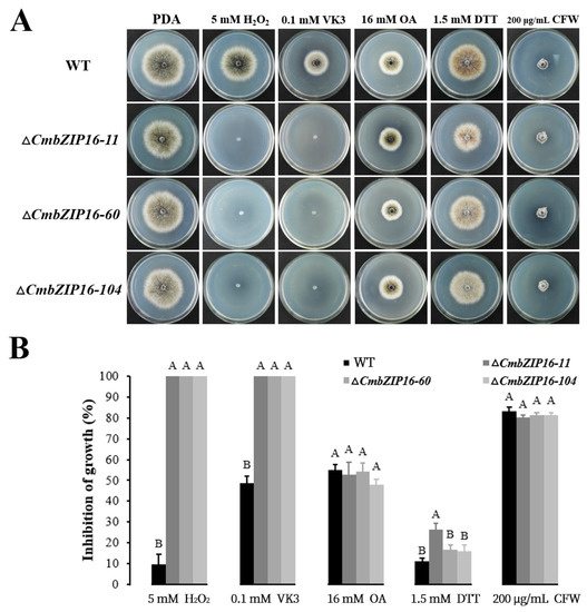 All of the four CmbZIPs mutants were examined for phenotypic changes in colony morphology, growth rate, conidial production, parasitic ability, and tolerance against the abiotic stress agents. Results showed that individual disruption of four CmbZIP genes had no significant effects on colony morphology, mycelial growth, conidiation, and mycoparasitism (data not shown). The ΔCmbZIP16 mutants (ΔCmbZIP16-11, -60, and -104) showed hypersensitivity to the oxidative stress (5 mmol L−1 H2O2 and 0.1 mmol L−1 VK3) (Figure 9). However, the knockout mutants of other three CmbZIP genes (CmbZIP-7, -9, and -13) exhibited no appreciable difference with respect to the WT in response to the abiotic stresses, including 5 mmol L−1 H2O2, 0.1 mmol L−1 VK3, 16 mmol L−1 OA, 1.5 mmol L−1 DTT, and 200 μg mL−1 CFW (data not shown).