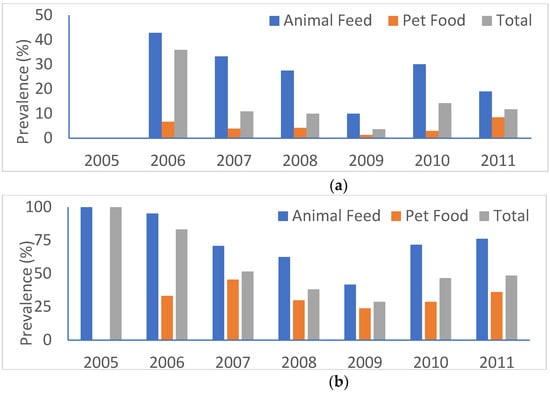 Prevalence of E. coli and Enterococcus spp. by year and animal food category. (a) E. coli; (b) Enterococcus spp.