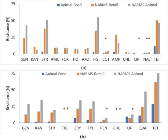 AMR of E. coli and Enterococcus spp. compared with NARMS 2011 retail meat and animal data. Each asterisk above the bar (*) indicates insignificant differences in resistance rate between isolates recovered from animal food and those from NARMS retail meat or NARMS animal. (a) E. coli; (b) Enterococcus spp. Abbreviations for antimicrobials are in (a): GEN, gentamicin; KAN, kanamycin; STR, streptomycin; AMC, amoxicillin-clavulanic acid; FOX, cefoxitin; TIO, ceftiofur; AXO, ceftriaxone; FIS, sulfisoxazole; COT, trimethoprim-sulfamethoxazole; AMP, ampicillin; CHL, chloramphenicol; CIP, ciprofloxacin; NAL, nalidixic acid; and TET, tetracycline; and in (b) GEN, gentamicin; KAN, kanamycin; STR, streptomycin; TIG, tigecycline; ERY, erythromycin; TYL, tylosin; PEN, penicillin; CHL, chloramphenicol; CIP, ciprofloxacin; QDA, quinupristin/dalfopristin; and TET, tetracycline. Antimicrobials not shown are amikacin for E. coli, and daptomycin, linezolid, nitrofurantoin, and vancomycin for Enterococcus spp. due to no resistance and/or unavailable NARMS 2011 data (amikacin and daptomycin).