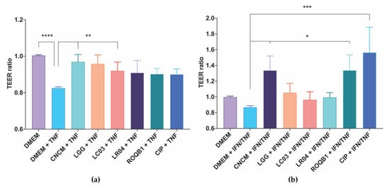 Screening of Lactobacillus species for their protective effects on intestinal epithelial cells permeability. TEER was assayed using (a) Caco-2 and (b) T84 cells grown on 24-well Transwell plates. TEER was measured before adding 6.106 CFU of bacterial onto the apical surface for 3 h prior to treatment of the cells with a solution of TNF-α for Caco-2 cells and a mix of IFN-γ and TNF-α for T84 cells for 21 h at 37 °C and 10% CO2. TEER was measured a second time at the end of the 24 h of coincubation. Statistical analysis consisted of one-way ANOVA followed by Dunnet’s multiple comparison test. * p < 0.0332, ** p < 0.0021, ***p < 0.0002, and **** p < 0.0001.