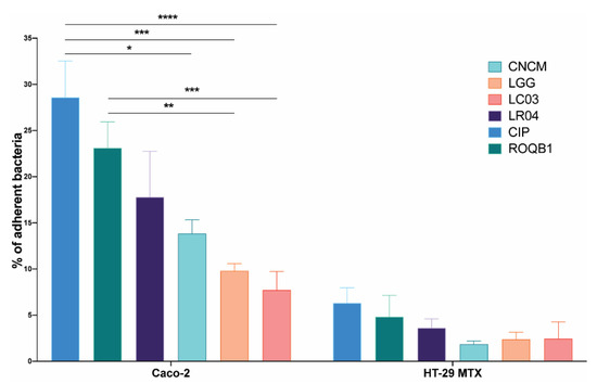 Adhesion of the six Lactobacillus strains on intestinal epithelial cells Caco-2 and HT-29 MTX. A bacterial suspension of a concentration of 108 CFU/mL was applied to the intestinal cells. After 1 h of incubation, cells were washed to remove nonadherent bacteria and detached using 0.5% Triton X-100. Harvested solutions were then diluted in PBS X-1 and the bacteria enumerated. Results are expressed as the percentage of bacteria adhering to the intestinal cells. Statistical analysis consisted of two-way ANOVA followed by Sidak’s multiple comparison test. **** p < 0.0001, *** p < 0.0002, ** p < 0.0021, and * p < 0.0332.