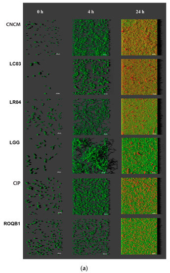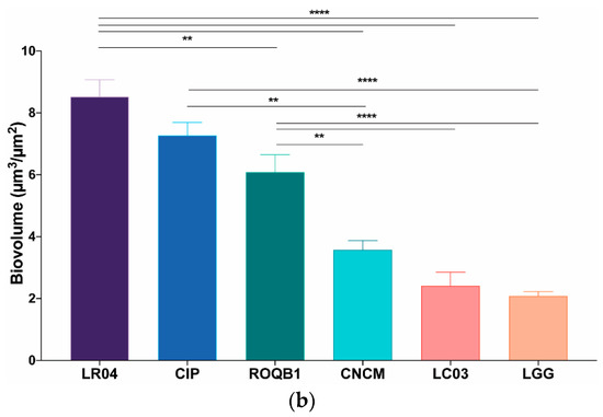 We analyzed the biofilm formation by the selected strains, in microscopic-grade 96-well plates, at 0, 4, and 24 h by using HCS-CLSM. The representative images were treated with IMARIS dedicated software (Figure 3a). Virtual shadow projections of the biofilm are represented on the right side of the images. The three isolates, LC03, LR04, and LGG, formed short chains that were visible after the adhesion (0 h). The chains formed by the LC03 strain were over-winded. For these three strains, the morphotypes observed were not specific to the adherent populations, as they were also observed for the planktonic bacteria in the stationary phase. After a short period of incubation (4 h), the adherent chains of the three isolates elongated to form an aerial structure. The LGG isolate showed a particular phenotype after 4 h with 3D aerial organization, which is likely associated with chain elongations and cohesion factors. The existence of sparse cells and aggregates labeled with PI indicate the presence of dead or damaged bacteria in those 24-h communities. The six Lactobacillus strains were able to form biofilms with different biovolumes of between 2 and 9 µm3/µm2 after 24 h of biofilm formation (Figure 3b, p < 0.05).