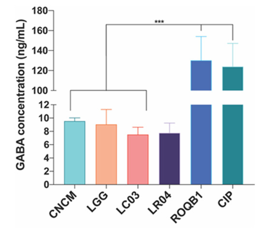 We tested the six Lactobacillus strains for their ability to secrete the neurotransmitter GABA. Culture supernatants were collected after overnight growth, and GABA was quantified by UHPLC-QqQ-MS. All strains were able to produce GABA, ranging from 7 to 130 ng/mL (Figure 6). Strikingly, ROQB1 and CIP exhibited the highest level, reaching 130.2 ± 23.86-ng/mL and 123.9 ± 23.29-ng/mL GABA.